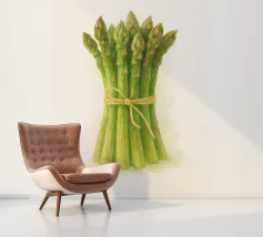 Un'affascinante illustrazione di un fascio di asparagi freschi, legati in modo semplice e disegnati in toni tenui e terrosi. Perfetta per cucine, sale da pranzo o ambienti in stile casalingo, che fondono il calore rustico con un design pulito e moderno.