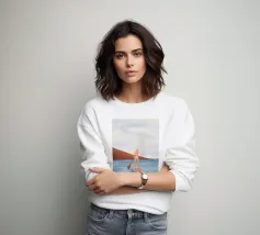 Questo dipinto digitale raffigura una serena scena di spiaggia tropicale in cui una surfista si trova a piedi nudi sulla sabbia bianca, con in mano una tavola da surf giallo brillante. Guarda l'oceano calmo, in attesa dell'onda perfetta. Palme imponenti incorniciano la composizione, mentre sullo sfondo si ergono lussureggianti montagne verde scuro sotto un cielo azzurro parzialmente nuvoloso. L'opera evoca un'atmosfera pacifica e avventurosa, ideale per gli amanti del surf, dei viaggi e dei paesaggi costieri. Le pennellate pittoriche e la tavolozza di colori tenui evidenziano la tranquillità e la bellezza naturale di un paradiso tropicale.