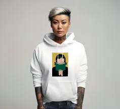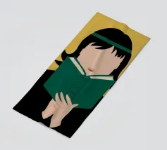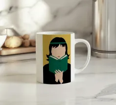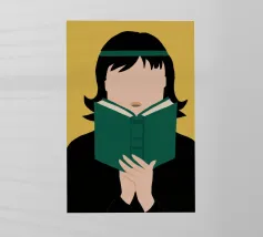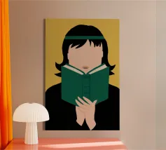 Ritratto di una persona con un taglio di capelli nero a caschetto, completamente assorta nel libro verde che sta leggendo. Lo stile senza volto focalizza l'attenzione dello spettatore sull'atto della lettura e sulla tranquilla contemplazione.