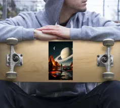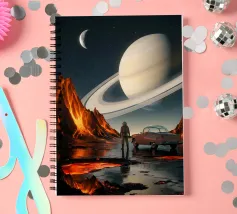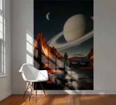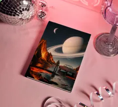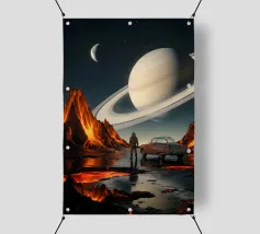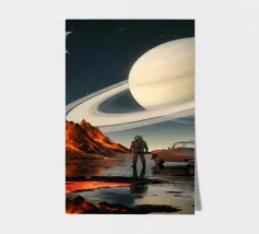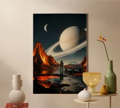 Entrate in uno straordinario paesaggio fantascientifico dove un astronauta e un'auto d'epoca si trovano davanti a picchi vulcanici incandescenti sotto gli enormi anelli di Saturno. Questa opera d'arte surreale fonde l'estetica retrò con la meraviglia cosmica, creando una scena drammatica piena di lava fusa, cieli stellati e dimensioni ultraterrene. Perfetto per gli appassionati di arte spaziale, di futurismo retrò e di mondi fantastici, questo pezzo aggiunge un forte impatto visivo a qualsiasi stanza. I suoi colori vivaci, l'illuminazione cinematografica e il senso dell'avventura ne fanno una dichiarazione accattivante per l'arredamento moderno delle pareti.