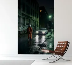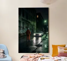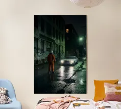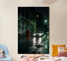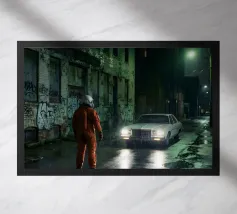 Questa opera d'arte d'atmosfera cattura un astronauta solitario in piedi in un vicolo buio e bagnato dalla pioggia, mentre una vecchia auto bianca si avvicina con i fari incandescenti. Il degrado urbano, i muri ricoperti di graffiti e i riflessi al neon creano un'atmosfera cinematografica e noir piena di tensione e mistero. Mescolando elementi fantascientifici con un realismo grintoso, questo pezzo è perfetto per gli appassionati di arte distopica, di narrazione futuristica e di scene notturne lunatiche. Un design sorprendente e drammatico che aggiunge intrigo a qualsiasi spazio moderno.