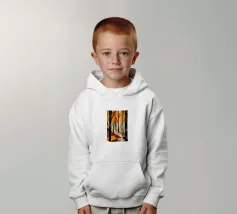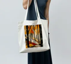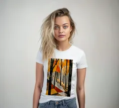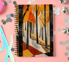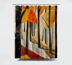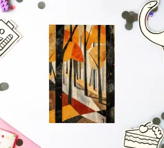 Una rappresentazione stilizzata di una foresta autunnale con alberi alti e scuri e fogliame arancione-dorato, realizzata con motivi geometrici. I toni caldi e lo sfondo strutturato evocano un senso di serenità stagionale e di moderna espressione artistica.