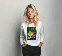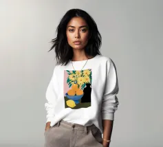 Un'elegante e semplice natura morta con un bouquet di fiori gialli in un vaso scuro accanto a una ciotola blu profondo piena di arance fresche. La composizione è serena e senza tempo, con un bel contrasto di colori.