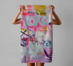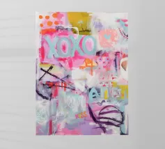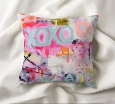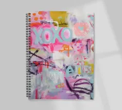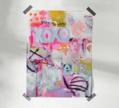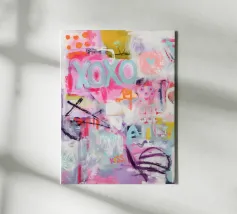 "XOXO" - un'allegra illustrazione artistica dai colori vivaci che celebra l'amore e gli abbracci! Il dipinto acrilico astratto combina motivi vivaci in rosa, azzurro e arancione, con pennellate dinamiche e pois che creano un movimento giocoso. Perfetto per una stanza moderna ed estiva!