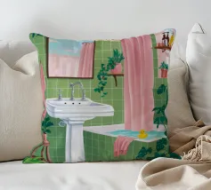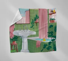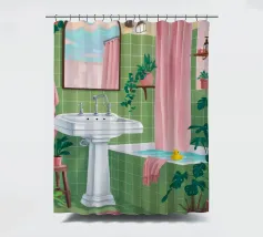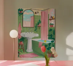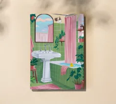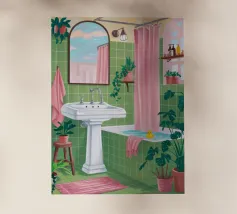 Una scena di bagno luminosa e pulita con piastrelle verdi, una vasca da bagno bianca e uno specchio che riflette ancora di più lo spazio vibrante. La stanza è piena di luce e crea un'atmosfera fresca, allegra e invitante.