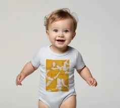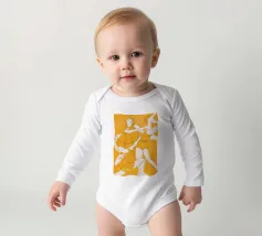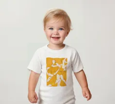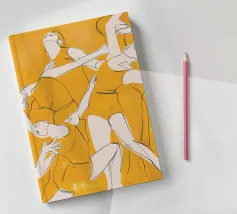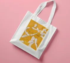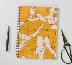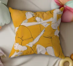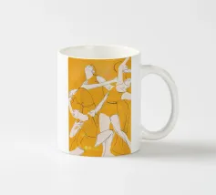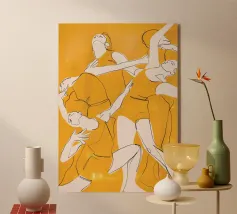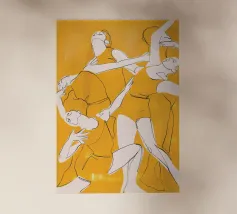 Un'opera d'arte astratta di figure femminili danzanti delineate in nero su uno sfondo giallo vibrante, che esprime ritmo e movimento in uno stile minimalista.