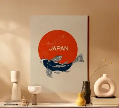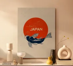Questa opera d'arte raffigura un elegante pesce koi che nuota con grazia su un audace cerchio rosso, simbolo della bandiera giapponese. Il movimento fluido della koi rappresenta forza, perseveranza e fortuna, profondamente radicate nella cultura giapponese. In alto, la frase "Welcome to Japan" aggiunge un tocco caldo e invitante, rendendo questo pezzo un perfetto connubio tra tradizione e arte.