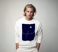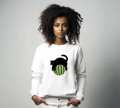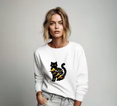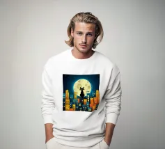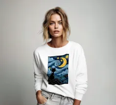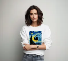 Un gatto nero siede in cima a una mezzaluna, fluttuando sopra una serie di linee blu ondulate che ricordano l'oceano. Il design minimalista utilizza colori vivaci per creare una scena stravagante e surreale.