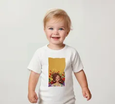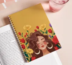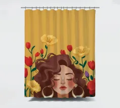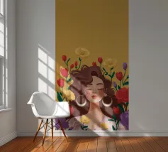 Questa opera d'arte mostra una persona con grandi orecchini a cerchio su uno sfondo di fiori colorati. La persona indossa un top giallo e i fiori creano un'atmosfera vibrante e vivace.