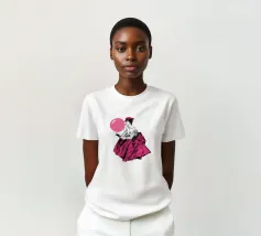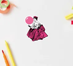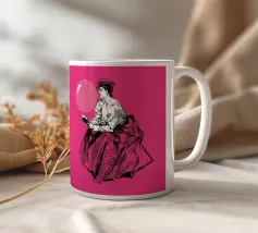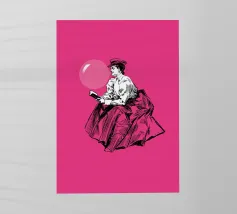 Illustrazione stilizzata di una donna dell'epoca vittoriana in abiti formali che legge un libro mentre soffia una grossa bolla di gomma da masticare, su un audace sfondo rosa. L'immagine combina l'eleganza vintage con l'umorismo della pop art moderna.