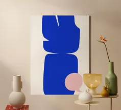 Forme astratte blu sono impilate verticalmente, contrastate da una piccola bolla rosa posizionata in basso. La composizione utilizza elementi di design minimali per creare interesse visivo attraverso il colore e la forma.