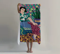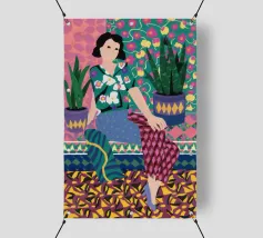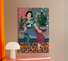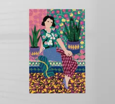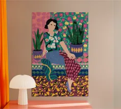 Una donna con un abito colorato e a fantasia è comodamente sdraiata su un tappeto a fantasia, immersa in un libro, circondata da una rigogliosa collezione di piante d'appartamento.