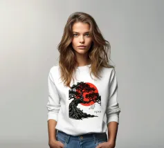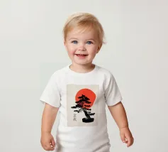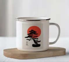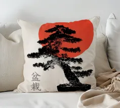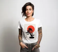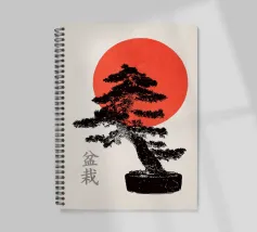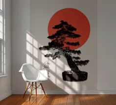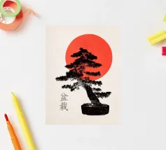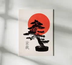 Illustrazione originale di un bonsai con un sole rosso.