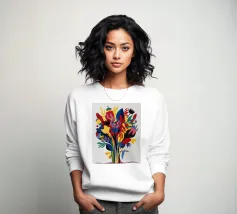 Una natura morta audace e astratta di fiori rossi in un vaso a righe bianche e nere. Lo sfondo è un collage giocoso di forme colorate e astratte, che creano una composizione dinamica ed energica.