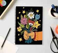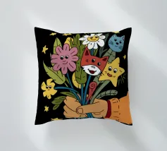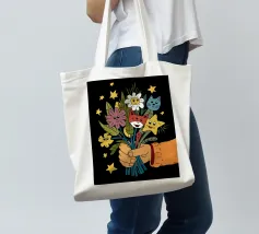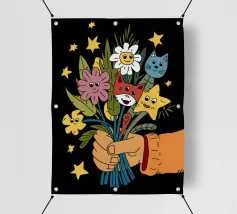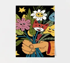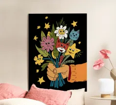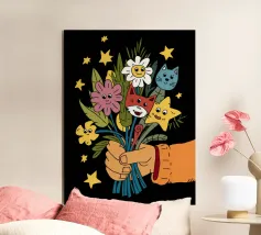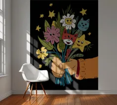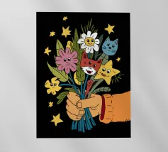 Un'illustrazione stravagante e commovente di una mano che tiene un mazzo di fiori, con i simpatici volti di tre gatti diversi che fanno capolino tra i fiori.