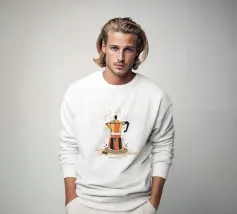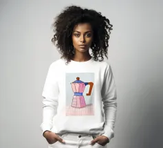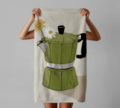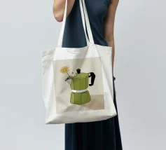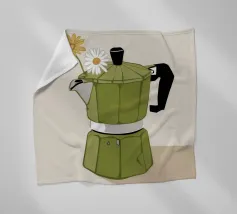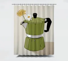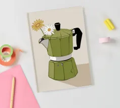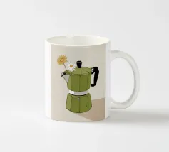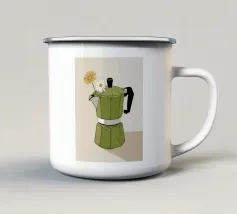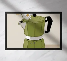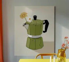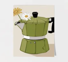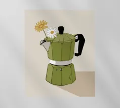 La classica caffettiera Moka è elegantemente presentata come un vaso che contiene una singola e delicata margherita bianca, unendo i rituali del caffè e la bellezza della natura in una natura morta minimalista.