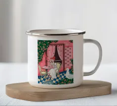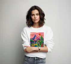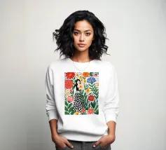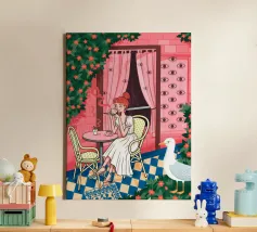 Un'affascinante scena di caffè in cui una donna siede a un tavolo circondata da pareti rosa, fiori vivaci e verde lussureggiante. L'ambiente emana calore e fascino artistico.