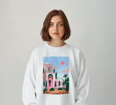 Un'affascinante scena di caffè in cui una donna siede a un tavolo circondata da pareti rosa, fiori vivaci e verde lussureggiante. L'ambiente emana calore e fascino artistico.