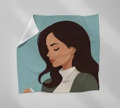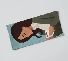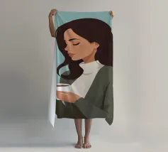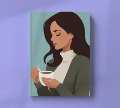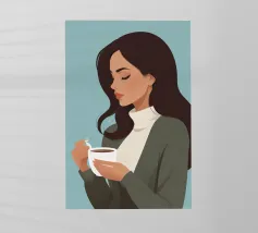 Una donna che tiene in mano una tazza di caffè caldo nella morbida luce del mattino. I toni delicati e le linee semplici ne fanno un'opera perfetta per le mattine lente e le routine tranquille.