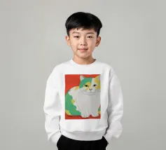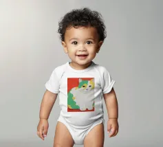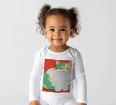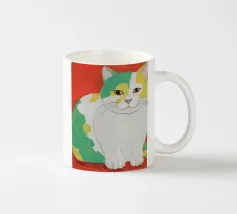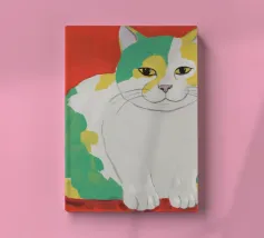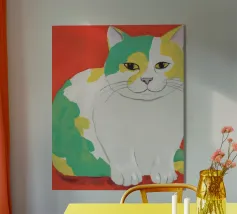 Ritratto stilizzato di un gatto calico con distinte macchie verdi e arancioni sulla sua pelliccia bianca. Il gatto ha un'espressione gentile ed è collocato su uno sfondo rosso deciso, che mette in risalto il suo manto unico.