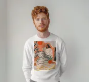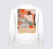 Una donna siede rilassata al centro di una luminosa tonalità di arancione. Il suo vestito a righe e il suo top floreale sembrano un mix di illustrazione di moda e arte moderna. Linee decise, colori caldi e un'ambientazione stilizzata fanno oscillare questo quadro tra serenità e forza. Una composizione che celebra la femminilità, la calma e la forza allo stesso tempo, ispirata alla grafica moderna e all'atmosfera mediterranea.