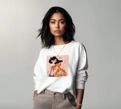Questo dipinto raffigura una persona dai lunghi capelli neri avvolta in una coperta a motivi cardiaci, che tiene in braccio un gatto. Il morbido sfondo beige esalta il tono accogliente e confortante.