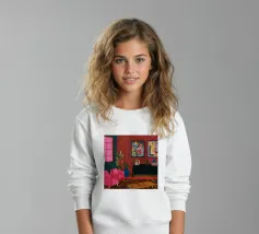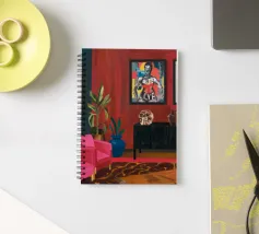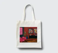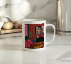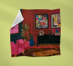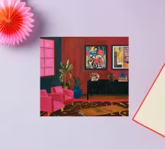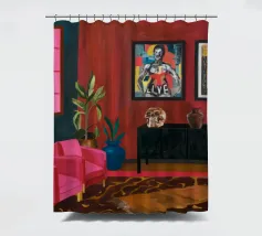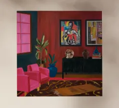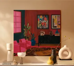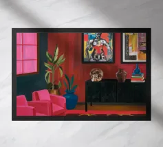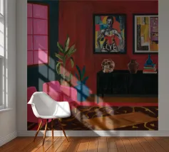 L'interno è un'esplosione di colori, con una poltrona rosa, pareti di un rosso vivace, un tappeto dai motivi ricchi e una credenza nera che espone un mix eclettico di oggetti e piante.