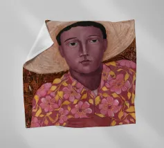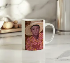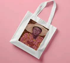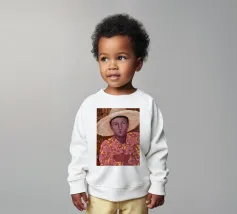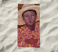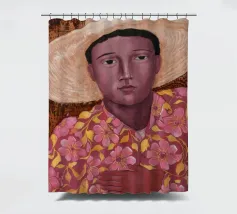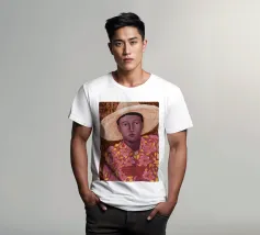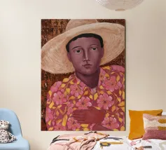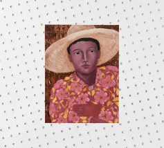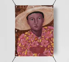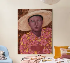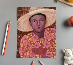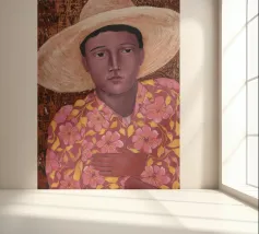 Un giovane con una vivace camicia a fiori fissa con intensità, sotto il peso di un grande cappello di paglia.