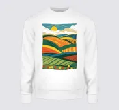 Un paesaggio vibrante di campi coltivati, ricchi e ondulati, sotto un cielo soleggiato con nuvole soffici. La rappresentazione stilizzata e colorata della campagna celebra la bellezza e l'abbondanza dei terreni agricoli.