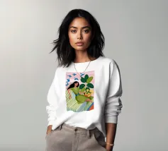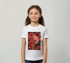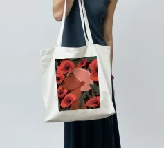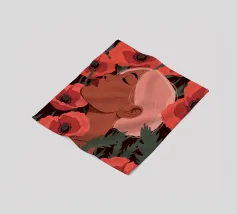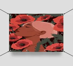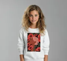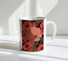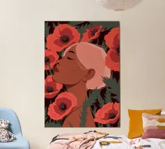 Questo dipinto raffigura una persona circondata da grandi papaveri rossi. La persona ha i capelli bianchi ed è rappresentata di profilo, creando un senso di tranquillità e di connessione con la natura.
