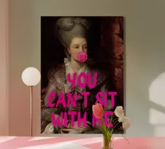 Fate una dichiarazione giocosamente esclusiva con "You Can't Sit With Me". Questa accattivante stampa pop art fonde magistralmente la ritrattistica classica, con una figura regale dall'elaborata acconciatura, con un tocco contemporaneo e umoristico. Una vivace bolla di gomma da masticare rosa è aggiunta giocosamente alle sue labbra, mentre il testo in grassetto rosa caldo "YOU CAN'T SIT WITH ME" sovrasta l'immagine, ispirandosi alla cultura iconica dei meme. È una miscela perfetta di eleganza senza tempo e arguzia moderna, ideale per aggiungere personalità e un tocco di spensierata esclusività a qualsiasi interno moderno. Realizzato con un eccezionale formato 7000x5000 p