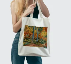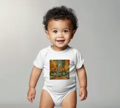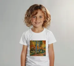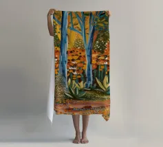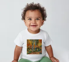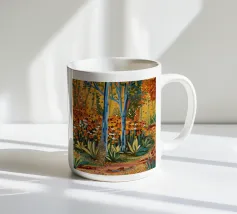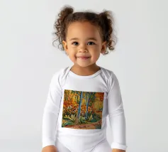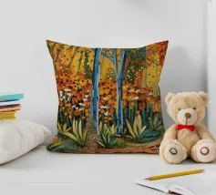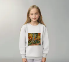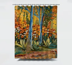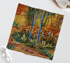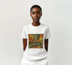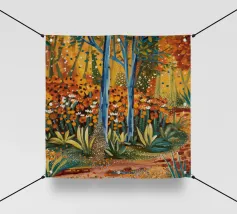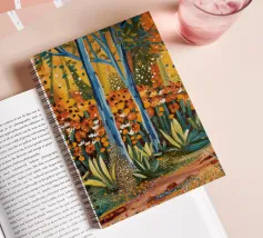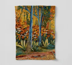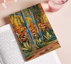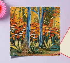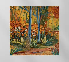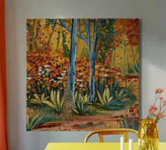 Una foresta lussureggiante sboccia con fiori bianchi e arancioni, che cantano con colori e trame stratificate.
