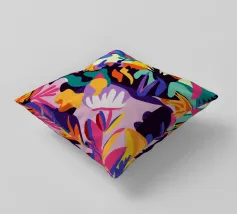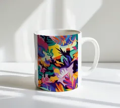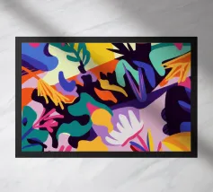 Un'esplosione caotica e cromatica di foglie colorate e sovrapposte crea un modello di giungla vibrante, energico e coinvolgente, pieno di vita e movimento.