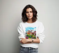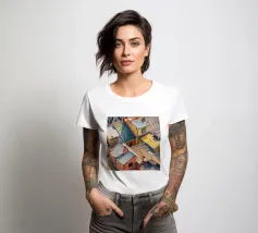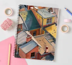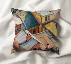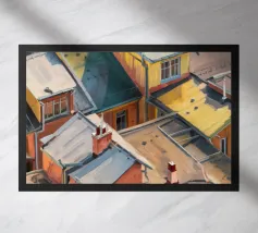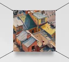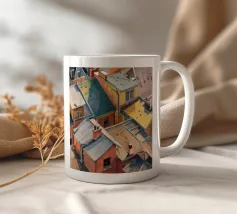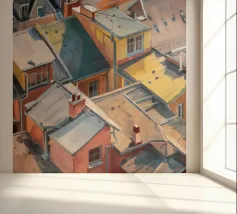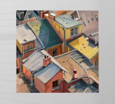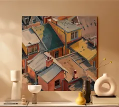Un'energica veduta dall'alto cattura una cascata di tetti colorati, gialli, rossi e blu, che si contendono lo spazio. Il dipinto è una celebrazione vibrante, quasi astratta, della trama densa e vivace di una vecchia città.