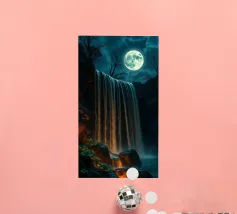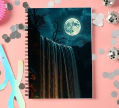 Una maestosa cascata scorre con grazia lungo le scogliere rocciose, illuminata da una luminosa luna piena. L'ambiente sereno è caratterizzato da sagome di alberi spogli e acqua scintillante.