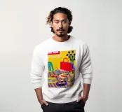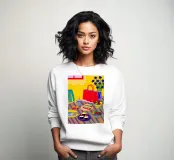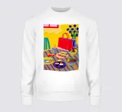 Una vivace illustrazione di una tavola imbandita con un'abbondante e colorata varietà di cibo, tra cui sushi e borse della spesa. La scena è una rappresentazione gioiosa dell'abbondanza e di un pasto soddisfacente dopo lo shopping.