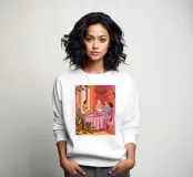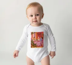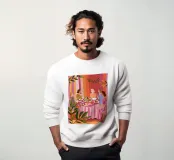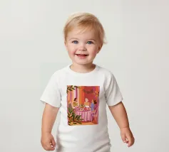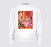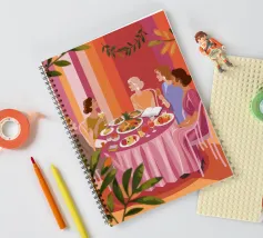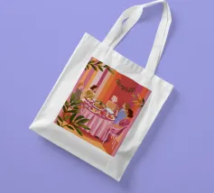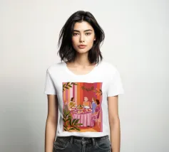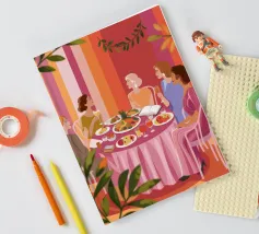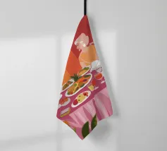 Questo dipinto ritrae un momento di calore di quattro persone sedute intorno a un tavolo rotondo coperto da una tovaglia rosa, che condividono un pasto. I motivi astratti, i colori vivaci e le piante sullo sfondo creano un'atmosfera invitante e vivace.