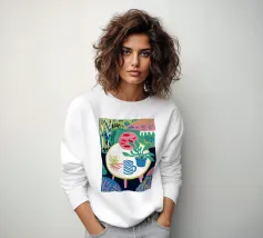 Ritratto di una bella donna dai lunghi capelli bianchi che tiene in mano un cesto di frutta tropicale, tra cui un ananas. La composizione è una vibrante, potente e rigogliosa celebrazione dell'abbondanza naturale e della bellezza femminile.