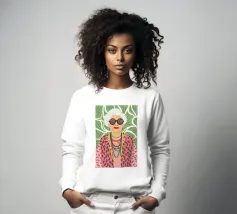 Ritratto di una bella donna dai lunghi capelli bianchi che tiene in mano un cesto di frutta tropicale, tra cui un ananas. La composizione è una vibrante, potente e rigogliosa celebrazione dell'abbondanza naturale e della bellezza femminile.