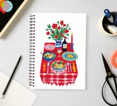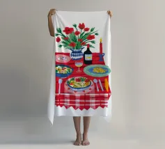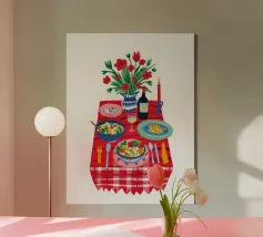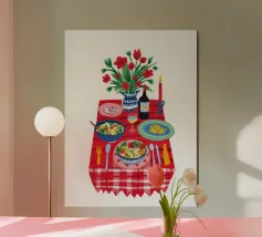 Un'affascinante natura morta raffigura un delizioso picnic su un telo di percalle rosso e bianco, con fiori in bottiglia, pane e marmellata, evocando un senso di dolce e rustica nostalgia.