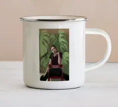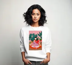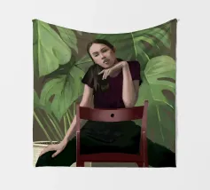 Ritratto di una donna seduta su una sedia rossa, incorniciata da grandi e rigogliose foglie di monstera. La sua posa riflessiva e la sua espressione calma evocano un senso di introspezione e chiarezza. I toni morbidi e terrosi e gli elementi naturali fondono il minimalismo moderno con la bellezza botanica, rendendo quest'opera d'arte perfetta per gli interni contemporanei.