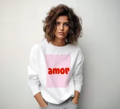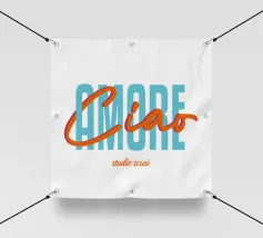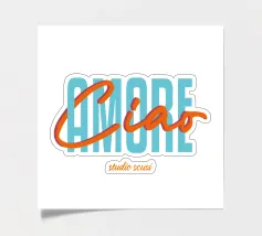 Una poesia d'amore visiva in tre colori e due lingue: La parola "AMORE" si staglia grande e azzurra sullo sfondo, come un silenzioso grido di desiderio. Davanti, "Ciao" cattura lo sguardo in un forte rosso arancio, con un affascinante effetto ombra che crea profondità e movimento. Sotto, quasi come una firma: "studio scusi" in un caldo giallo senape. Lo sfondo beige conferisce al motivo una calma mediterranea, come un tramonto in Liguria.