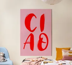Scoprite il nostro design allegro e affascinante "CIAO Bella". Questo vivace disegno presenta la parola italiana "CIAO" in grandi e audaci lettere rosse su uno sfondo rosa. Le lettere hanno un effetto pennellata che conferisce al disegno un aspetto artistico e dinamico. Sotto la lettera "A" c'è la scritta "bella" in un carattere più piccolo, che conferisce un ulteriore fascino e un messaggio affettuoso.
