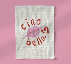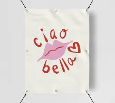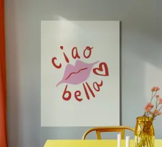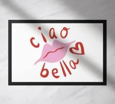 Una stampa "Ciao Bella" divertente e civettuola, con testo rosso e labbra rosa. Giocoso e spensierato, perfetto per aggiungere fascino alla camera da letto, al dormitorio o alla parete della galleria.