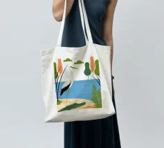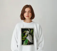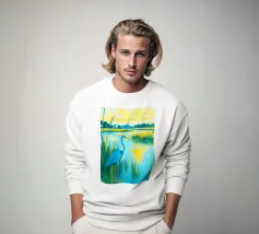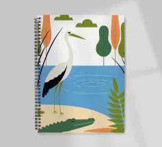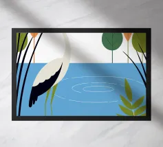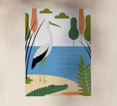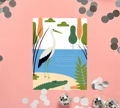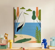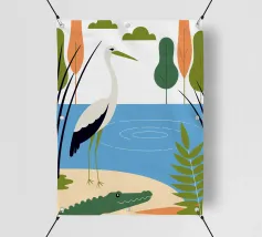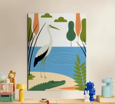Scoprite la bellezza della natura con un tocco di umorismo in questa opera d'arte con una cicogna e un coccodrillo come amici. I colori vivaci e i disegni unici creano un'atmosfera fresca e divertente.