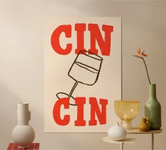 CIN CIN! Questo allegro poster tipografico porta lo stile di vita italiano direttamente sulla vostra parete. Con scritte in grassetto, un bicchiere di vino abbozzato e una strizzatina d'occhio, invita a far tintinnare i bicchieri. Ideale come regalo per gli amanti del vino o come decorazione elegante per la cucina e il bar con un tocco mediterraneo. Perfetto per chiunque celebri la vita.