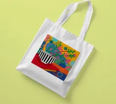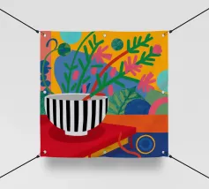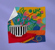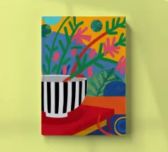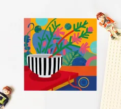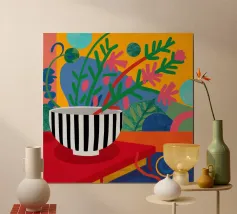 Una vivace natura morta astratta incentrata su una ciotola a righe bianche e nere, circondata da un tripudio di fiori, foglie e forme colorate.