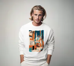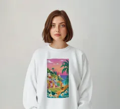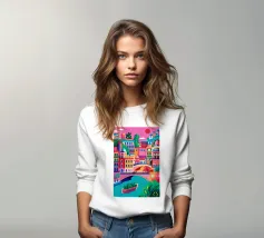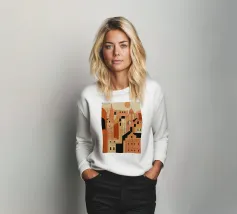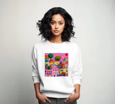 Una rappresentazione astratta e vivace di una città collinare con case colorate e a blocchi nei toni del rosa, del giallo e dell'arancione. La composizione è un'interpretazione moderna, energica e gioiosa di un villaggio mediterraneo.