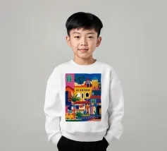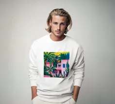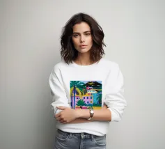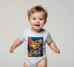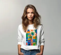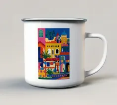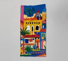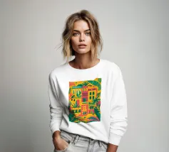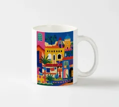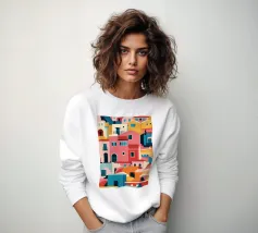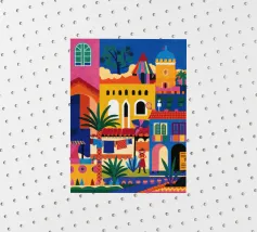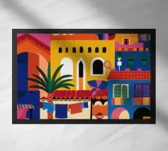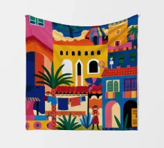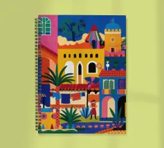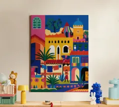 Un'illustrazione vivace ed energica di una colorata città collinare, con case, scale e piante ben strette. La scena è una rappresentazione vivace, gioiosa e bella di una comunità mediterranea o sudamericana.