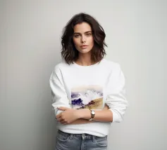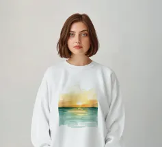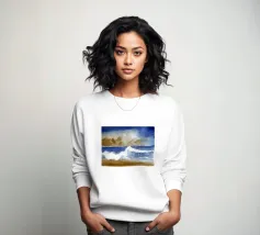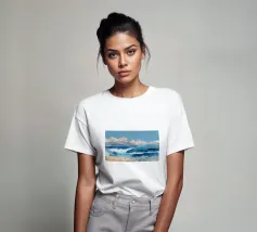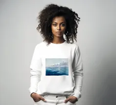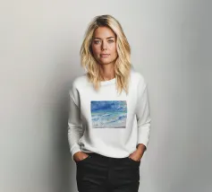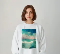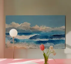 Una sognante miscela di nuvole soffici e blu vibranti crea un'ampia vista panoramica di cielo e mare. Il gioco di luci e colori è al tempo stesso arioso e solido.